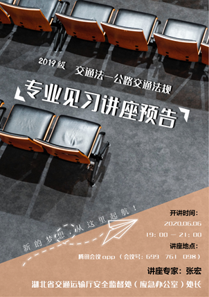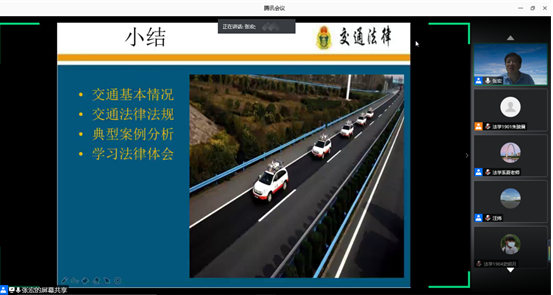 2020年6月6日晚上七点,法学系本科2019级在腾讯会议上举行了专业见习讲座:交通法——公路交通法规。特邀请湖北省交通运输厅安全监督处(应急办公室)处长——张宏主讲。在前期充分的准备下,法学系本科2019级的同学们提前进入腾讯会议,在高效的组织下有序签到,认真聆听,积极提问。