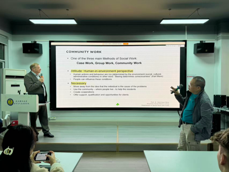 On the evening of October 19, 2025, Professor Dominique Moisl from the Department of Social Work at Fulda University of Applied Sciences, Germany, delivered a special lecture titled "Social Space Orientation: The Core Principle of Social Work in Germany" in Classrooms 913-915, Annex to Hongyi Building, East Campus. The lecture was translated by Associate Professor Liu Weihua from the Department of Sociology of our college, and was attended by 16 students from Fulda University of Applied Sciences, Germany, as well as more than 100 postgraduates and undergraduates majoring in Social Work from our college. Professor Dominique Moisl's research interests include social economy, social management, social research methods and evaluation.
