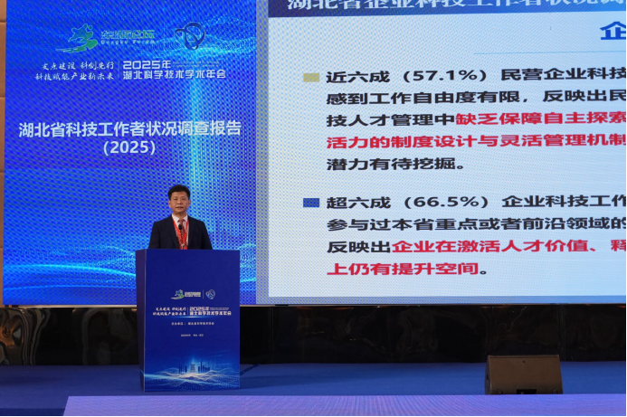 李志峰教授受湖北省科协委托,向大会发布《湖北省科技工作者状况调查报告(2025年)——湖北省企业科技工作者发展情况》。报告就湖北省企业科技工作者的生活状况、权益保障、工作满意度、科研参与及创新意愿、政策支持等方面的专项调查结果作简要汇报,并针对调查反映的问题提出了优化企业科技工作者状况的系列建议,旨在为湖北省企业科技工作者相关政策的优化完善提供参考。