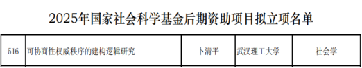近日,教育部社会科学司、全国哲学社会科学工作办公室先后发布了《2025年度教育部人文社会科学研究规划基金、青年基金、自筹经费项目评审结果的公示》《关于2025年国家社会科学基金项目立项名单的公示》。我院刘叶萍老师申报获得2025年国家社科基金青年项目立项,卜清平特岗教授申报获得2025年国家社会科学基金后期资助项目立项,周群英副教授、阎维博老师申报获得2025年度教育部人文社会科学研究规划基金、青年基金项目立项,具体名单如下: