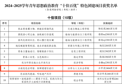 2025年4月14日,2024—2025年度青年思想政治特色团建项目评选结果揭晓,经团支部申报、基层团委推荐、学校评审,我院法学类2404团支部申报的《法韵悠悠启明智,例辉熠熠引前行》获评校十佳项目。