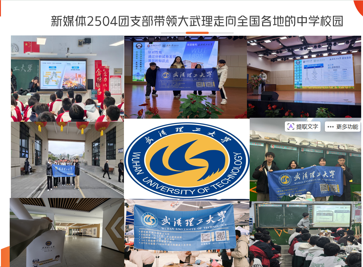 支部关雯心、于金琪等多名团员开展“寒假母校行”,奔赴全国各地中学校园开展招生宣讲。团员们围绕武汉理工大学办学规模、招生政策、录取情况等核心内容展开介绍,重点解读近三年湖北招生计划及中外合作办学等报考要点,同时分享备考经验与大学生活感悟,为学弟学妹答疑解惑,既搭建起高校与中学的沟通桥梁,也为学校招生宣传贡献了青春力量。