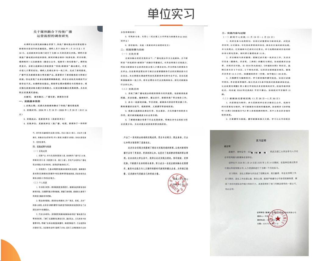为深化专业认知、锤炼实践本领,推动理论与实践深度融合,武汉理工大学新媒体2504团支部于寒假开展系列校外实践活动。支部团员分赴中学、新闻单位、社区基层等阵地,以母校行、专业实习、社区调研等形式躬身实践,在历练中增长才干,实践成效显著。