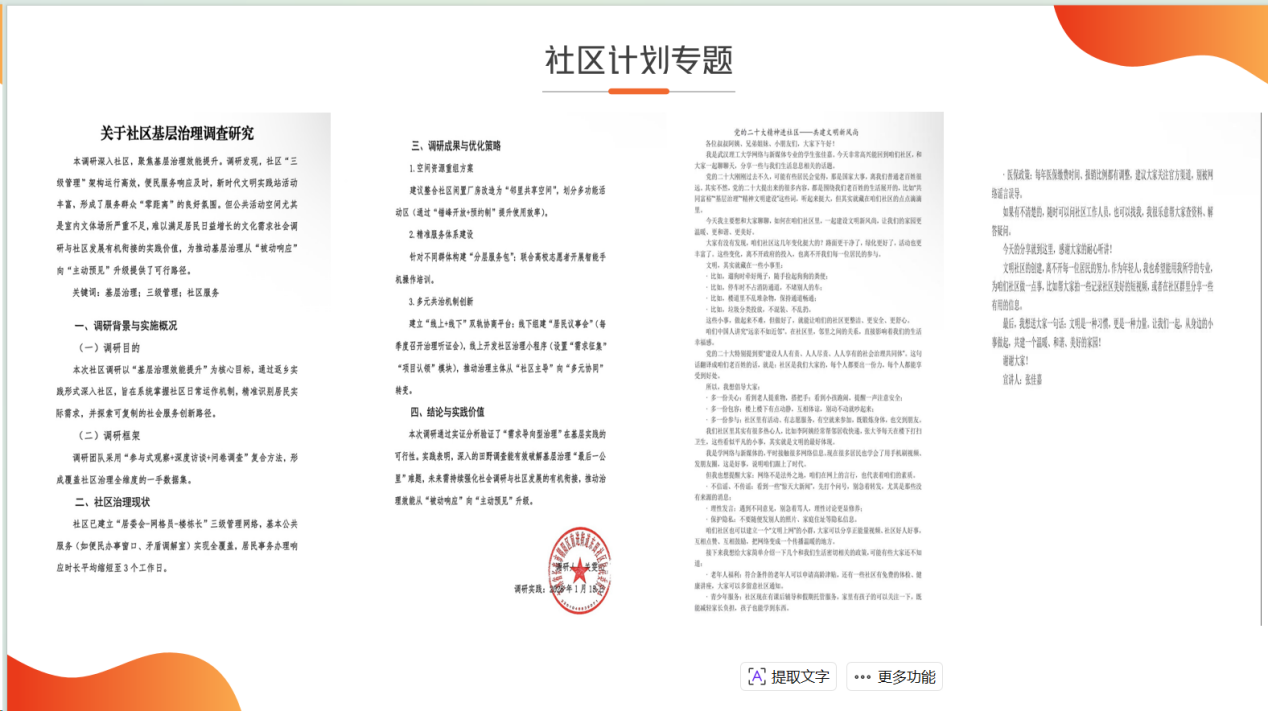 张佳嘉、关雯心聚焦基层治理,开展社区计划专题调研。团队采用多元调研方法,摸清社区“三级管理”架构的运行优势,也发现公共活动空间不足等问题,并针对性提出空间资源重组、精准服务建设、多元共治创新等优化策略。此外,张佳嘉走进社区开展党的二十大精神宣讲,结合生活实际解读精神内涵,倡导文明行为,讲解民生政策,让党的理论深入人心。