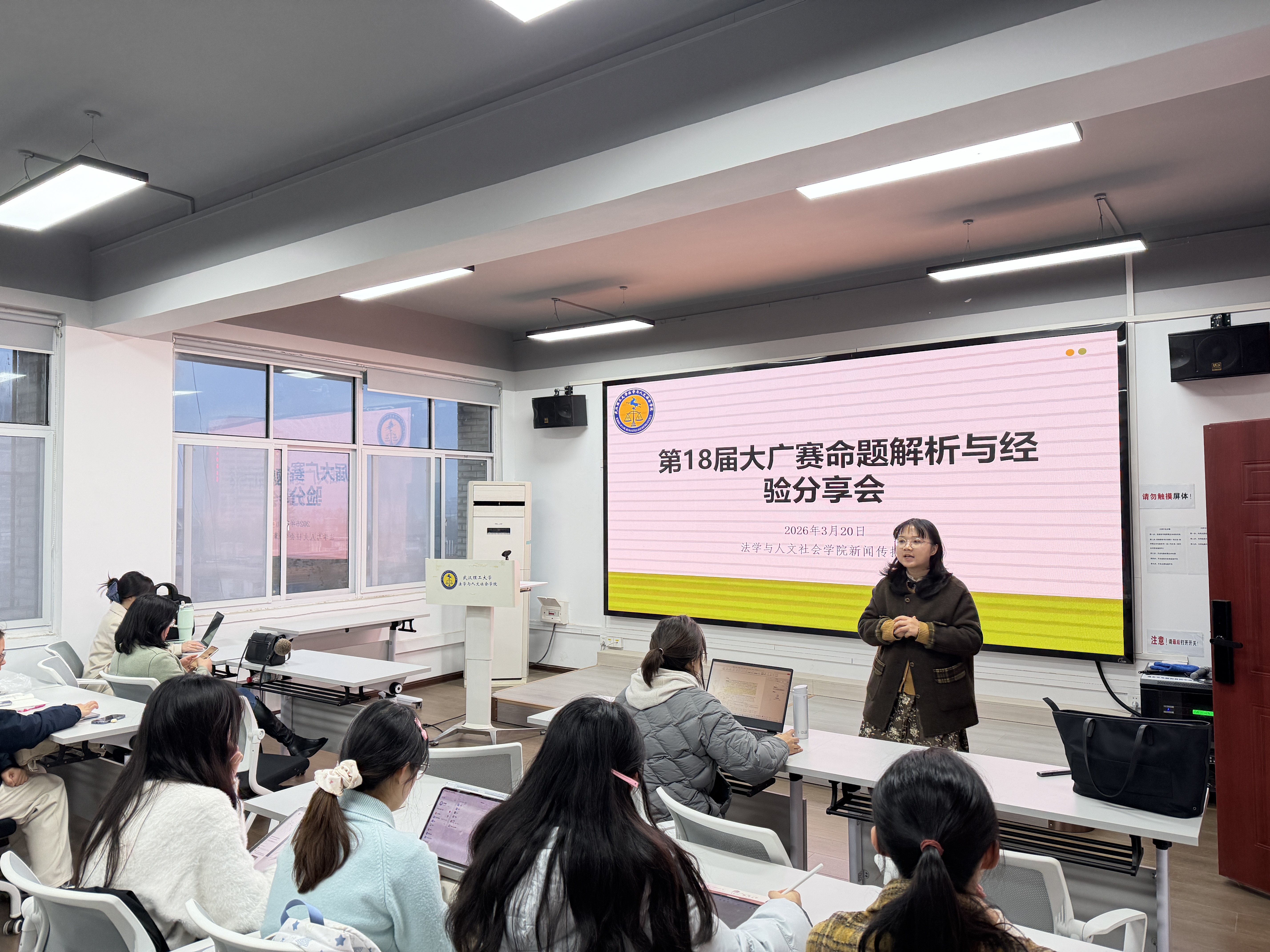2026年3月20日晚,法学与人文社会学院新闻传播系于东院教四附915教室,举办“全国大学生广告艺术大赛命题解析与经验分享会”。黄箐、方迎丰、李娜、刘林、刘叶萍等专业教师出席活动,学院众多学生到场参与学习交流。