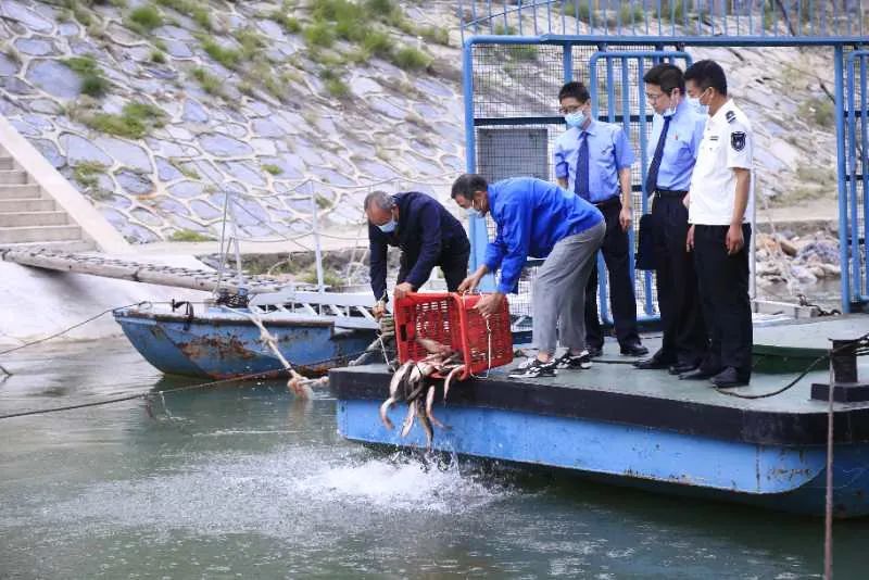 图:魏巍(左二)监督10名非法捕捞水产品犯罪嫌疑人在汉江增殖放流
