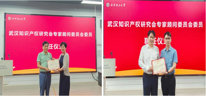 讲座开始前,现场举行了专家聘任仪式。华中师范大学法学院刘华教授为陶鑫良教授颁发专家顾问委员会委员聘书。法学系系主任胡神松教授为中伦律师事务所合伙人何丹律师颁发武汉理工大学校外兼职研究生指导老师聘书。
