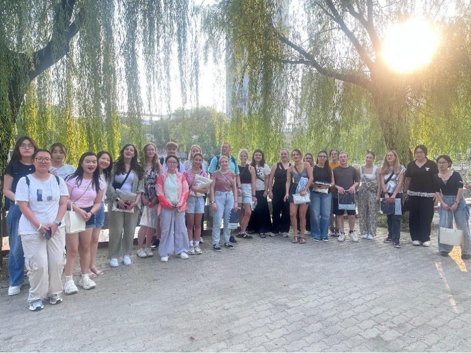 参观过程中,双方学生围绕中德社会文化差异、社会工作实践模式以及对社会学理论的学习体验等话题展开深入讨论。尤为温馨的是,漫步途中师生互相担任“语言老师”,德方学生认真习练“你好”“谢谢”等中文问候,中方学生则认真模仿德语的基本发音。全程在知识与情感的轻松氛围中自然交融,不仅展示我校办学特色,更在青年之间搭建起超越国界的理解与友谊之桥。