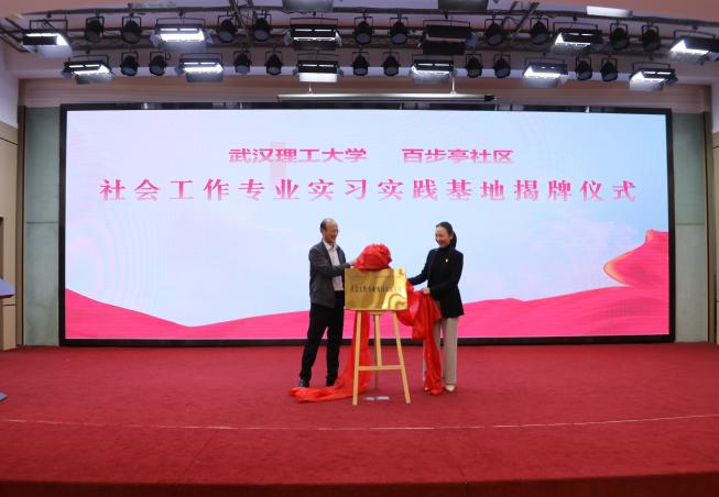 在全体与会人员的见证下,副院长吴露和百步亭社区党委委员田欢共同签署社会工作专业实习实践基地协议。学院党委书记耿英刚与百步亭社区党委书记王波一同为实践基地揭牌,标志着校社合作进入新阶段。