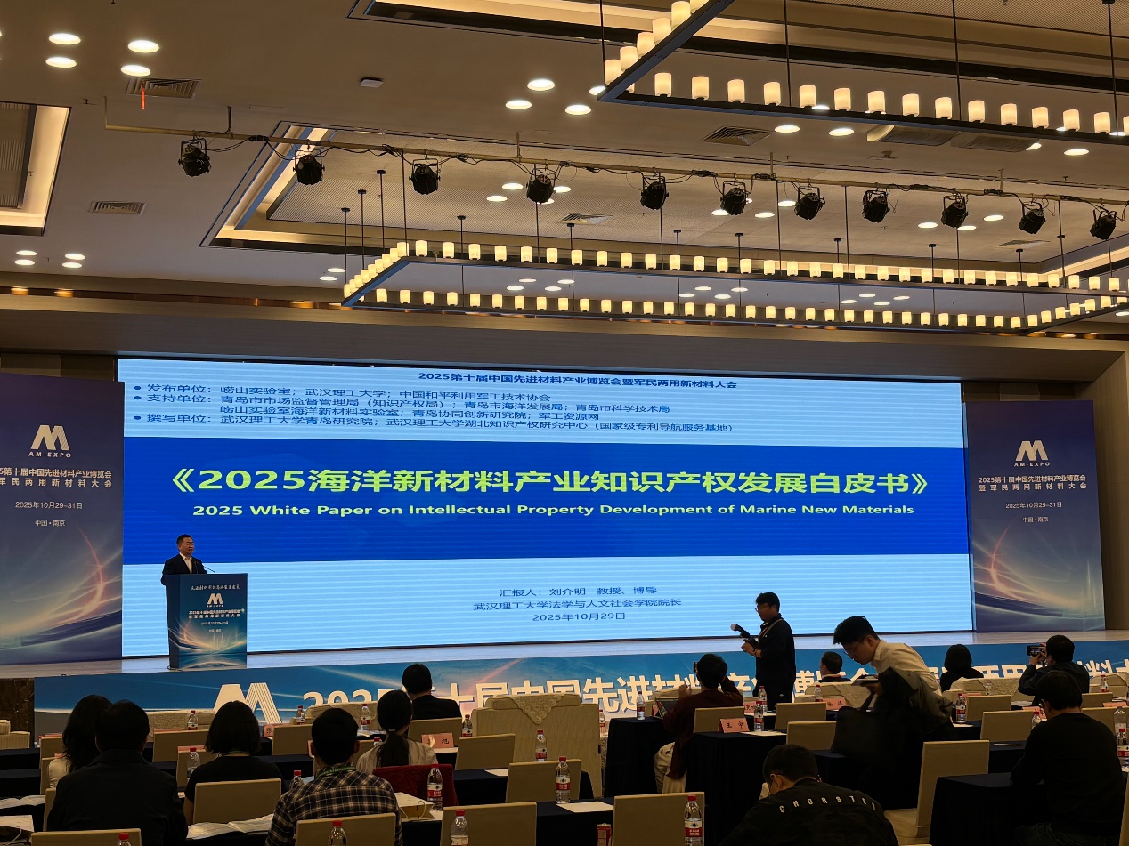 10月29日至31日,由中国和平利用军工技术协会、全联科技装备业商会和武汉理工大学等单位联合主办的第十届中国先进材料产业博览会暨军民两用新材料大会在南京国际展览中心召开。29日下午,学院院长刘介明教授知识产权团队与武汉理工大学青岛研究院在会上联合发布了《2025海洋新材料产业知识产权发展白皮书》。