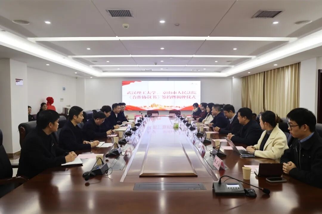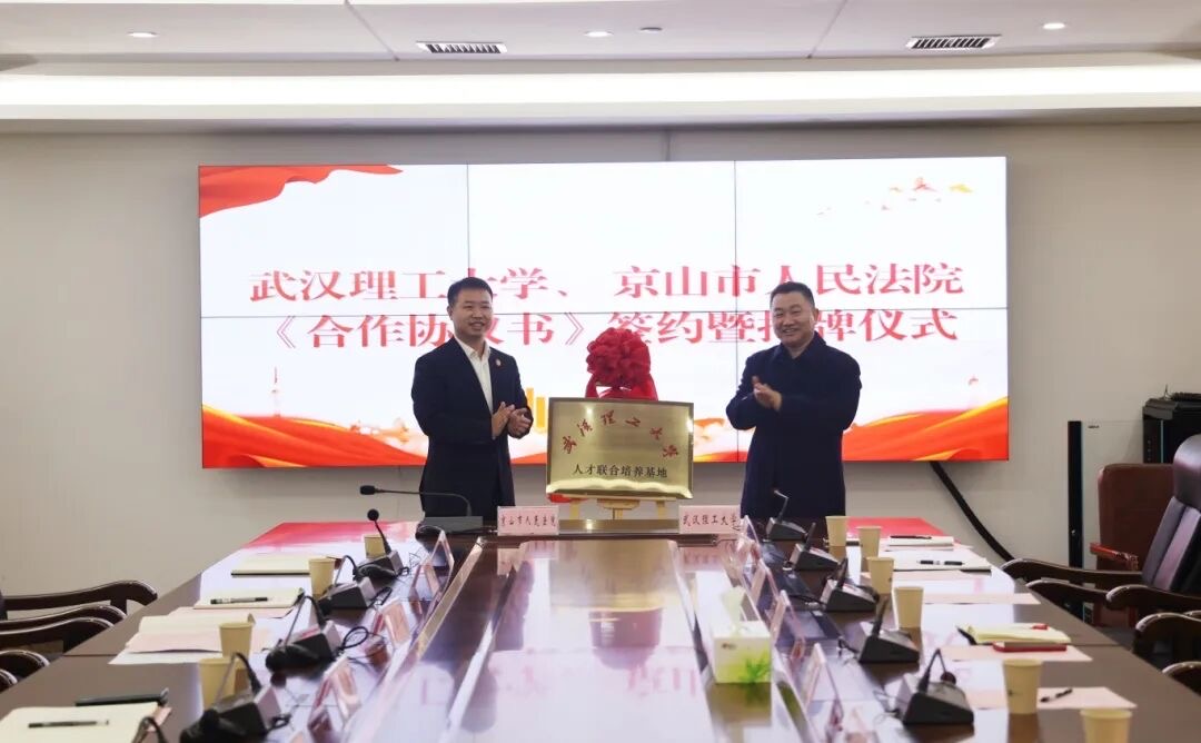 11月21日下午,武汉理工大学法学与人文社会学院与京山市人民法院举行了《人才联合培养协议书》签署暨人才联合培养基地揭牌仪式。此次合作旨在推动高校法学教育与基层司法实践的深度融合,实现法学教育与司法实践的双向赋能。荆门市中级人民法院副院长丁凤彩,庭长周加友,副庭长袁达成,京山市人民法院院长赵李平,副院长杨生波,副院长张小敏,政治部主任刘丽,执行局局长曹振华,学院院长刘介明,副院长何平,副院长吴露,法律诊所中心主任马卉,专硕中心主任孟奇勋等出席了活动。