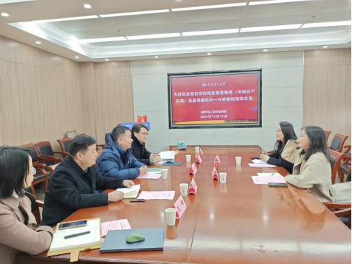 12月18日上午,武汉市市场监管局(市知识产权局)知识产权促进处副处长段晶津、二级主任科员刘曌青一行来院展开调研交流。院长刘介明、法学系主任胡神松以及青年教师代表高珺、博士后于洁阳等参加了会议,座谈会由学院专硕中心主任孟奇勋主持。