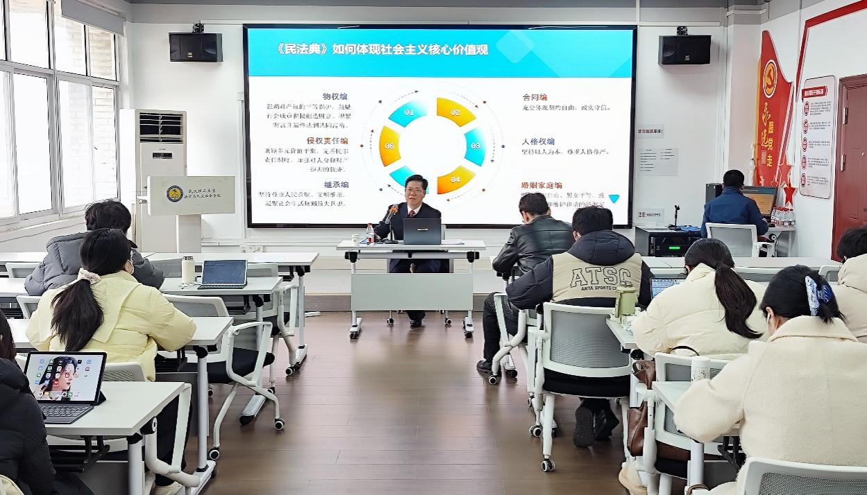 2025年12月30日上午,武汉海事法院党组书记、院长李群星莅临武汉理工大学法学与社会学院,为师生带来了一场主题为“用生动司法实践践行社会会主义核心价值观”的精彩讲座,生动阐释了社会主义核心价值观在司法领域的实践,本次讲座由耿英刚书记主持。