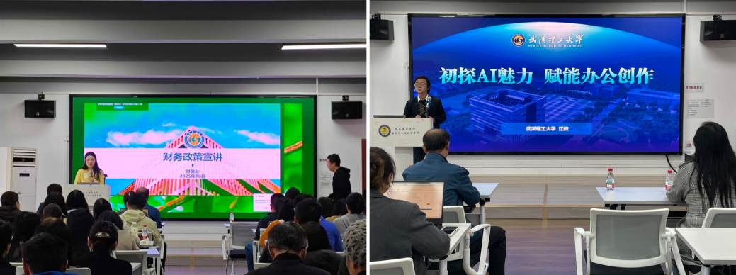 此外,活动还邀请了学校财务处的唐喆老师、自动化学院的江炽老师,分别就“科研经费管理政策”与“AI赋能办公创作”等内容进行了讲解培训。