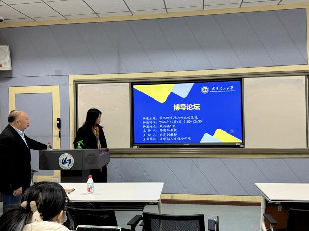 2025年12月4日,华中师范大学文学院邹建军教授应邀做客武汉理工大学,在致远楼开展主题为“学术的发现与论文的呈现”的专题讲座。本次讲座由汉语言文学系主任孙霞副教授主持,系内教师及研究生近五十人到场聆听。