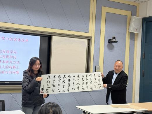 讲座接近尾声时,进入互动提问环节。现场同学就文学在当今世界的意义,学术写作中如何寻找参考文献,在“经典”与“创新”之间取得平衡等问题踊跃提问。邹建军教授一一回应,既给出具体操作建议,又分享自己的学术体会和珍贵墨宝,现场气氛热烈而融洽。
