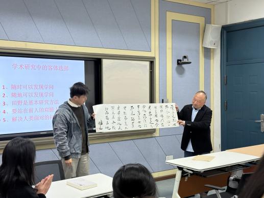 三是在“发现自我主体”部分,邹建军教授把视角转向青年人的学术人生。他指出,要把自己当成学者,充分构建自己的学术主体性,只有在真正关切的问题上,才能积蓄持续深入的研究热情。在此基础上,他引经据典,深刻阐释了“自我主体的建构”“理性与感性的统一”“做一个有学问的人”的意义,鼓励学生在严谨方法与个人感悟之间找到平衡,将自己的人生经验转化为学术问题和研究视角。在谈到“学术研究中的客体选择”时,他提出,学问可以“随时发现、随地发现”,田野调查是重要的基本研究方法,做研究要善于站在前人的肩膀上,更要有“解决人类面临的问题”的宏大胸怀。